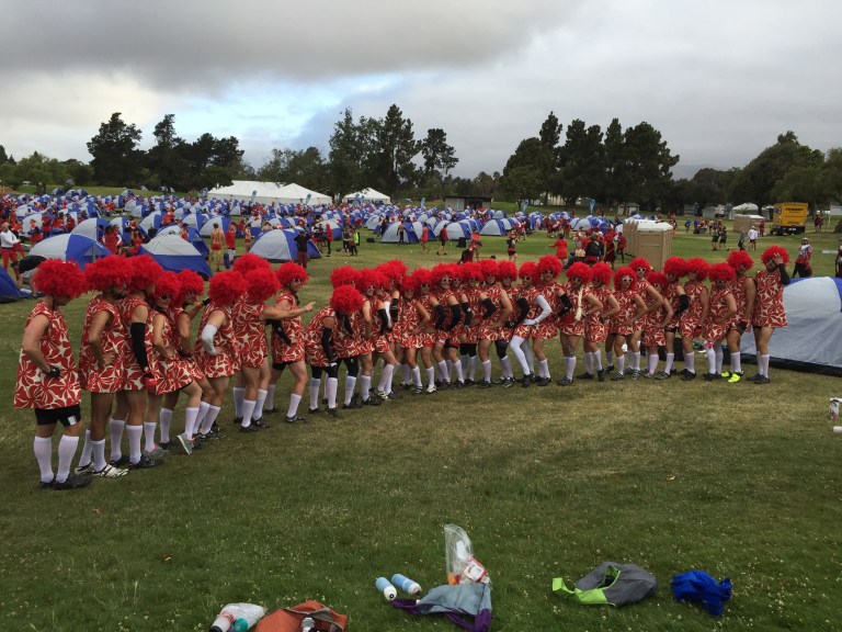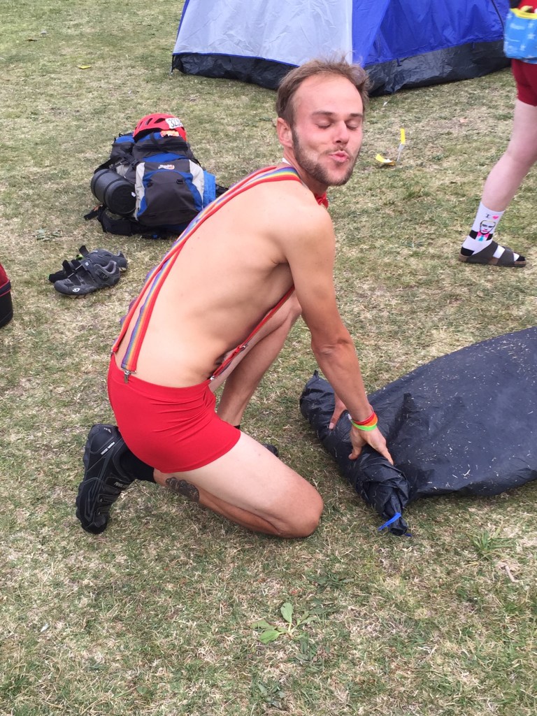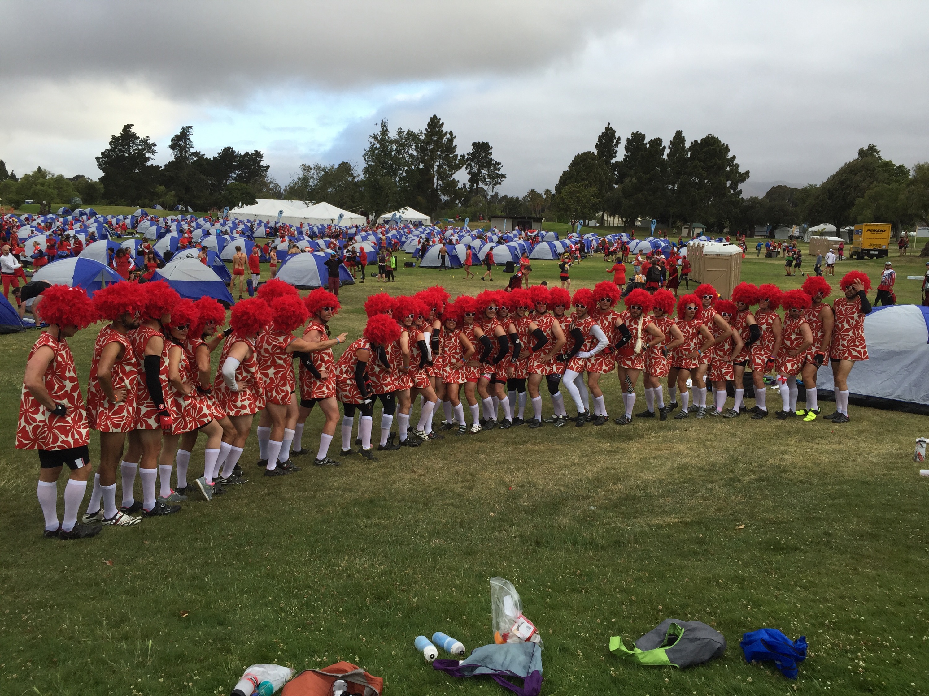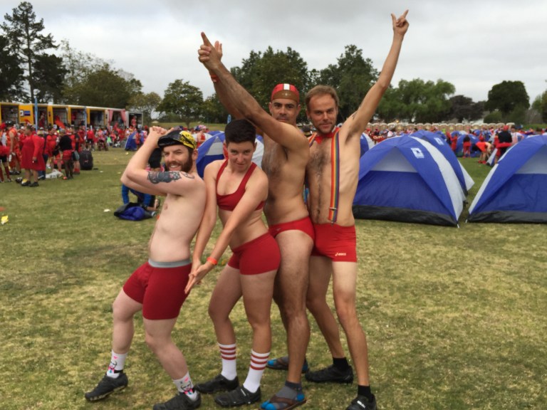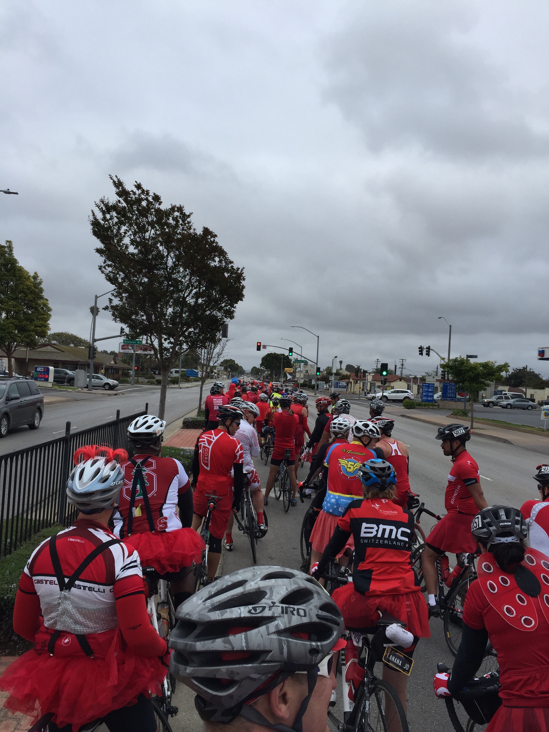After leaving Rest Stop 1, we made our way down the road to Rest Stop 2 and through some awesome climbs behind Vandenberg Air Force Base. Just like Rest Stop 1, Rest Stop 2 was incredibly cold. In fact, it got quite misty and damp. I mention this because majority of the Cal riders chose to carry on a certain tradition–wearing as little red as possible (aka a speedo or bikini). Those guys were freezing cold. We quickly had our fun and began making our way down the road again.